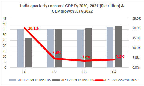 This seems like a cakewalk, with the economy growing at 20.1 percent in Q1 over the same quarter last year. But as the graph below illustrates, it is anything but. GDP levels in quarters 2 to 4 last year, were not only marginally better than in 2019-20 but also significantly higher than in Q1, which represents the economy at the bottom of the V, U or L shaped curve. The red line tracing quarterly growth this year versus the previous year’s quarter is consequently likely to dip sharply downwards from 20.1 percent in Q1 to growth levels between 4 to 5 percent in succeeding quarters, ending the year with an average growth between 8.5 to 9.5 percent.